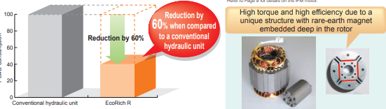 So với các bộ nguồn thủy lực thông thường thì Ecorich R giúp giảm đến 60% năng lượng tiêu thụ trong quá trình hoạt động. Điều này giúp nhà sản xuất tiết kiệm được tối đa chi phí đầu tư. Bên cạnh đó, hệ thống còn sử dụng momen xoắn và hiệu suất cao của động cơ IPM độc quyền của DAIKIN, giúp gia tăng năng suất làm việc đáng kể