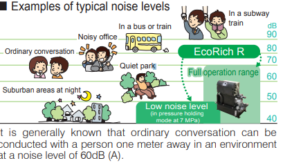 Tại chế độ giữ áp tối đa, độ ồn của Ecorich R hoạt động ở ngưỡng 50 dB, các chuyên gia đánh giá đây là độ ồn ở mức tương đối thấp tương đương với âm thanh vào buổi tối ở khu vực ngoại ô. Khi máy chạy ở công suất tối đa, độ ồn cũng không quá 70dB. Với độ ồn thấp, ECORICH R mang lại hiệu quả khá rõ rệt trong vấn đề ô nhiễm tiếng ồn, việc sống lâu trong tình trạng tiếng ồn lớn gây ra sẽ mang đến cho người sử dụng những tình trạng như: Căng thẳng, stress, lo lắng thậm chí trầm cảm, tăng huyết áp, mất ngủ, ảnh hưởng đến hoạt động của não…